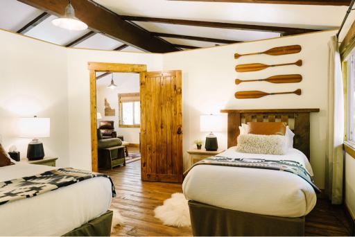 This suite sleeps 2-6 guests and is perched above the rest of the ranch, with a birds eye view of the river and grounds. It has two bedrooms – each with one queen and one single bed. A sitting area, dining area, spacious deck and full bathroom all make the Riversuite the place to hang!