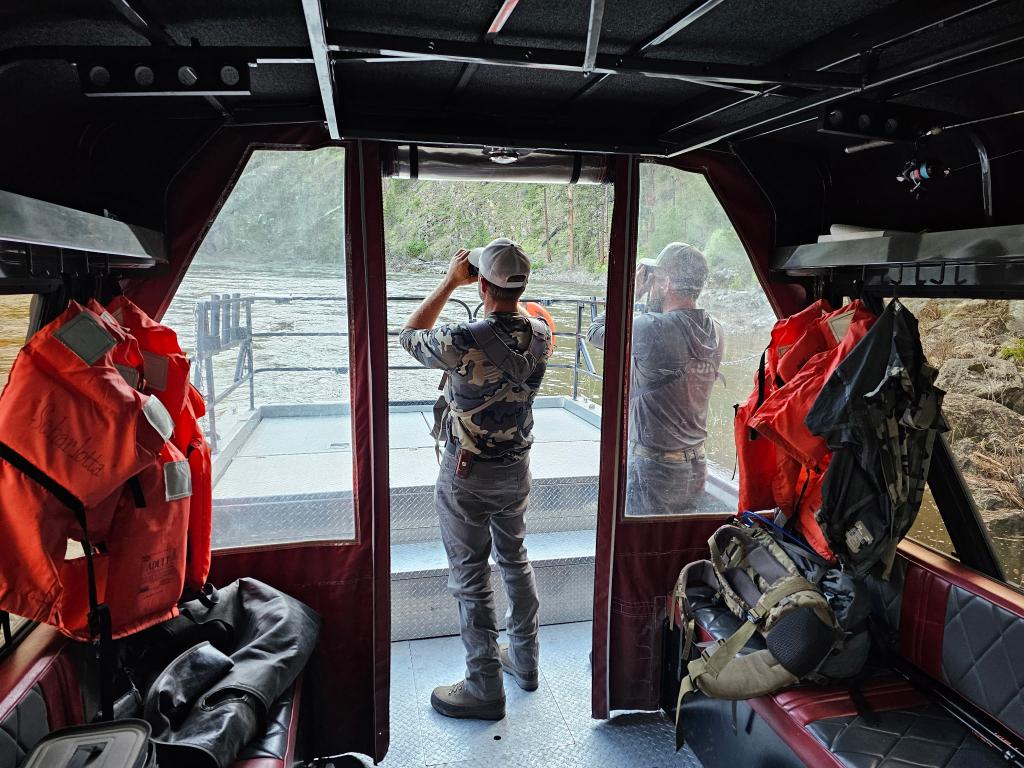 From there, you’ll board a custom twin-engine jet boat, pushing over 1,000 horsepower, built to navigate the powerful and unpredictable Salmon River. As you travel upriver, it becomes clear just how remote this experience truly is.